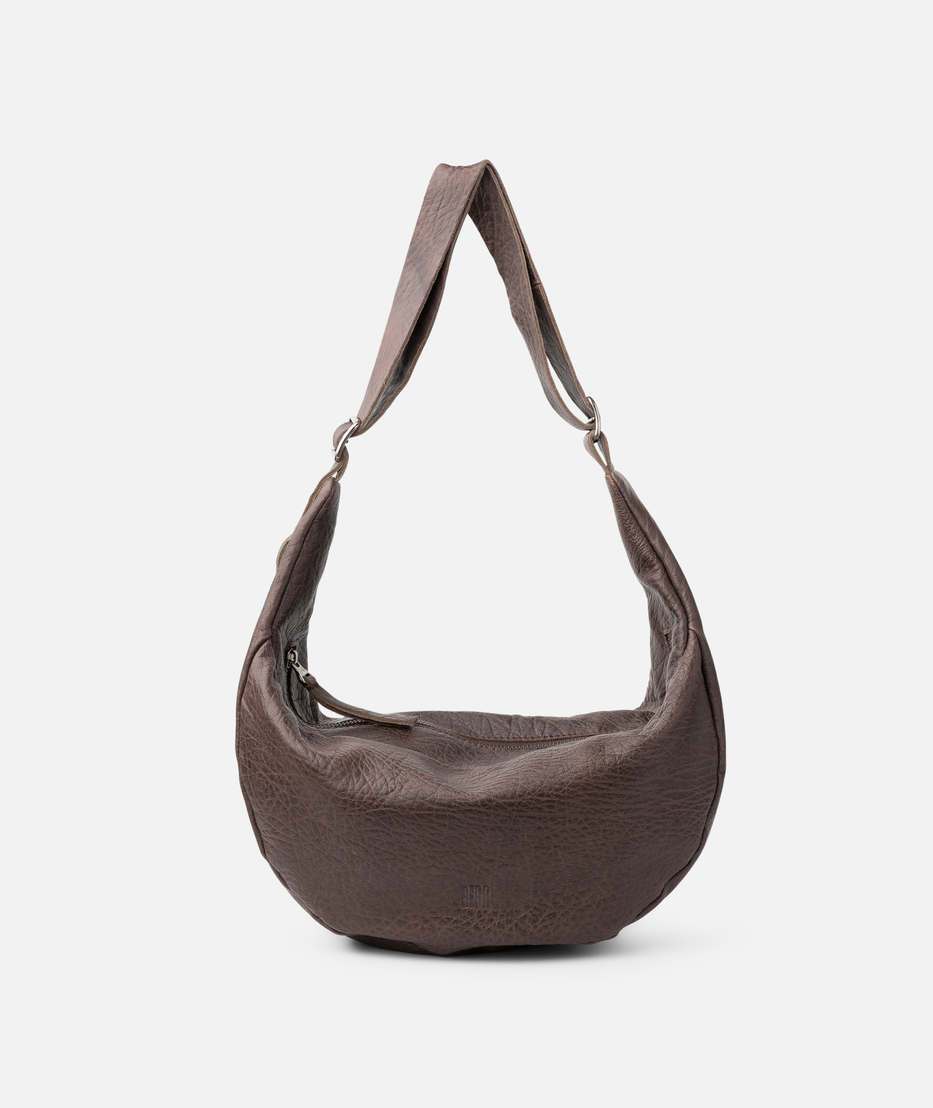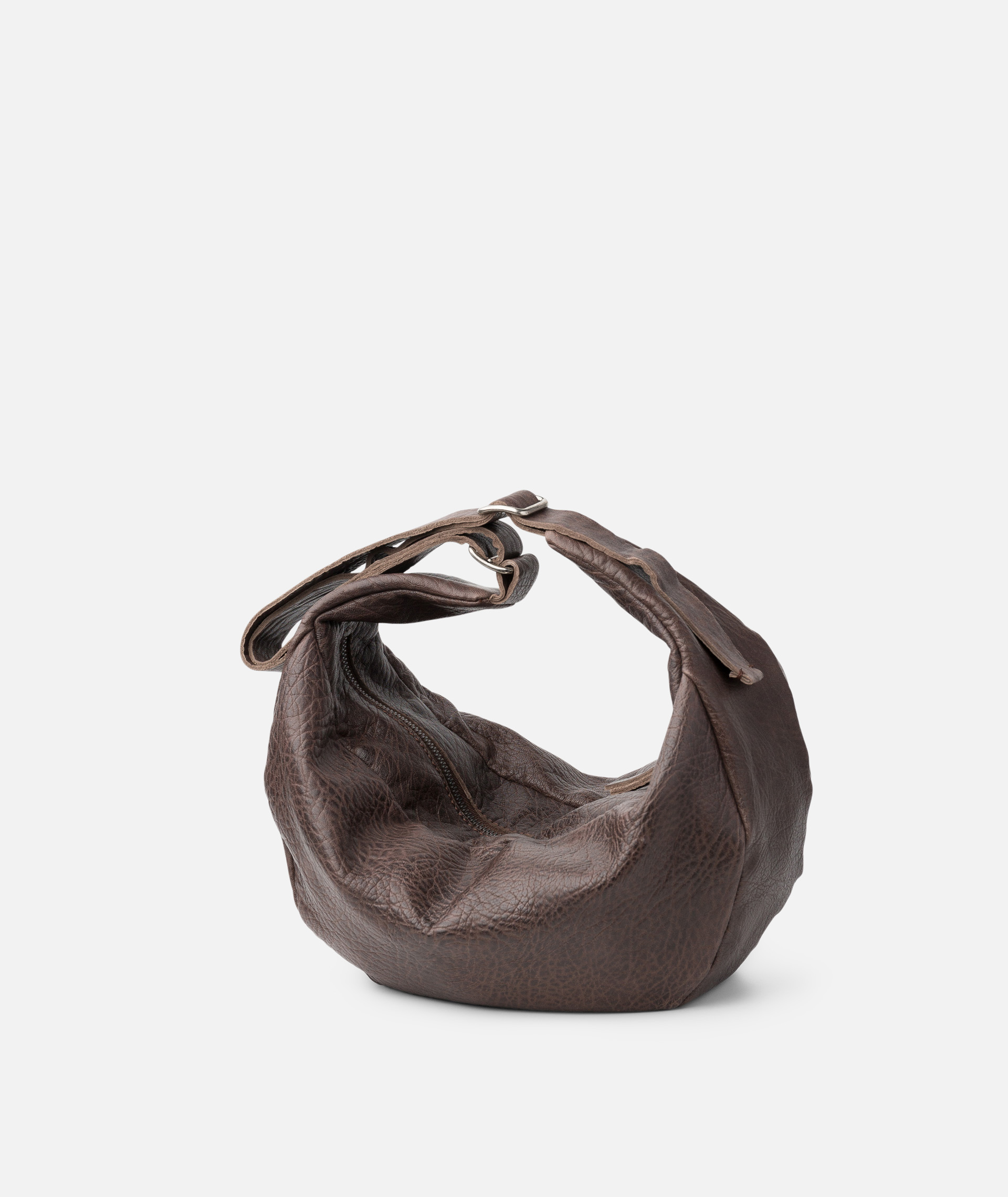 Hobo pequeño de piel ovina, efecto ‘elefante’ adquirido por bombeado de la piel. Asa multiposición que permite llevarlo al hombro o cruzado.
