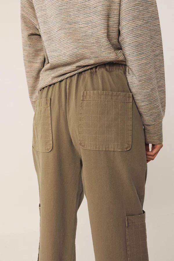 Pantalón de fit relajado con cintura engomada con un aire al pantalón cargo. Tiene bolsillos parche de corte francés y de parche con tapeta a los laterales. Su pernera fluída te hará sentir super comfy.