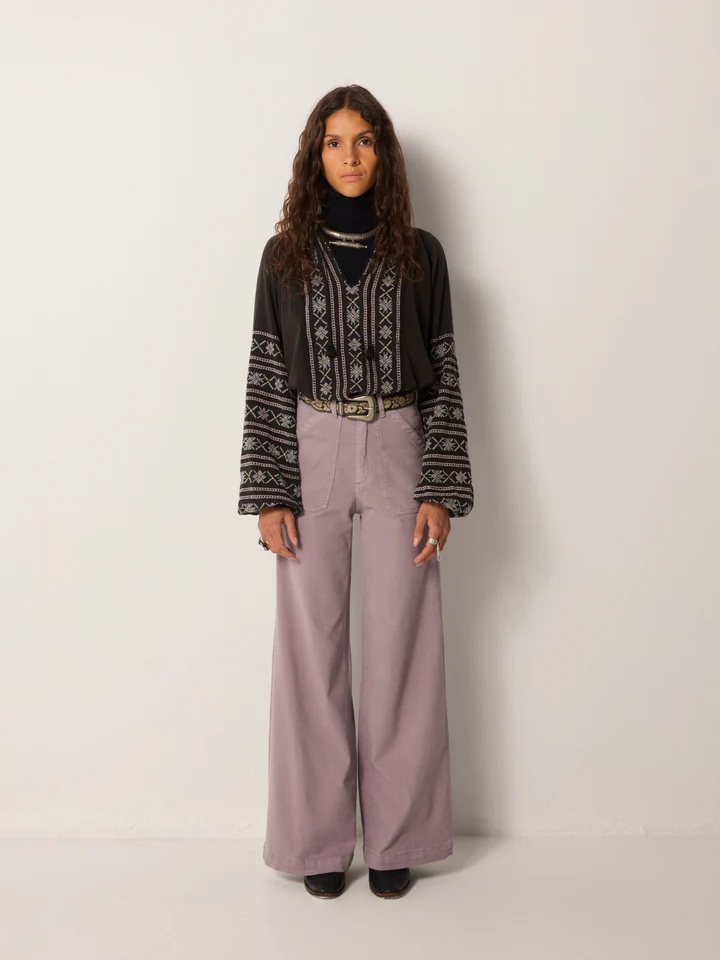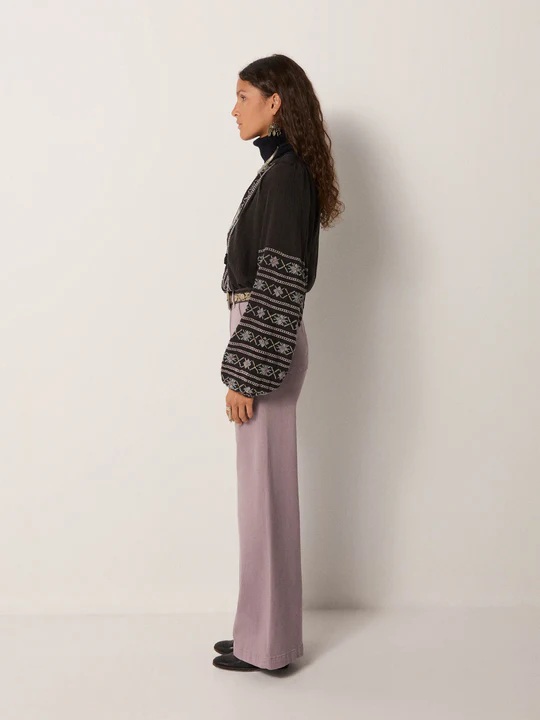 El tono lila se siente fresco, aportando ligereza a un corte de inspiración retro. Sutil pero distintivo, destaca sin abrumar. El corte ancho mantiene el pantalón relajado, mientras que su acabado limpio garantiza un acabado impecable.