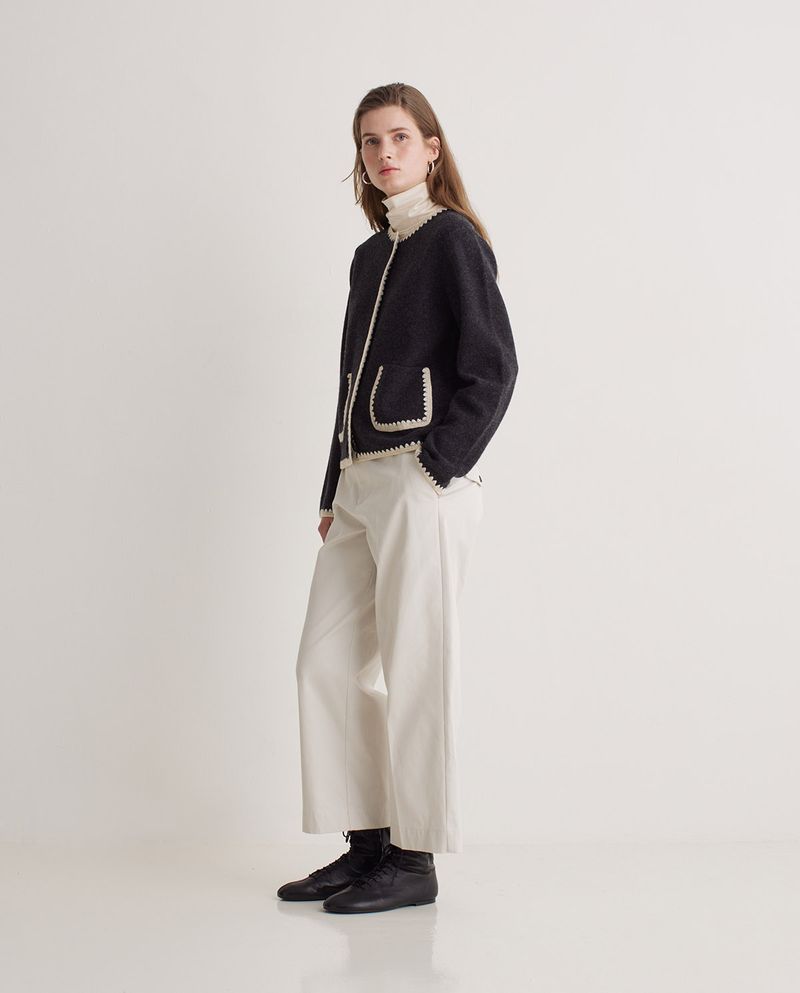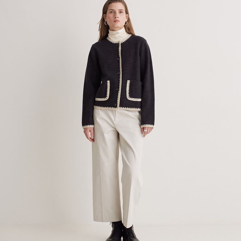 Una chaqueta de punto con estructura marcada y botones grandes que le dan un aire robusto y moderno. Perfecta como prenda exterior en días frescos.