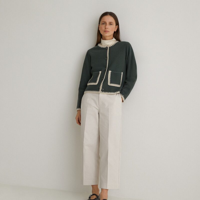 Una chaqueta de punto con estructura marcada y botones grandes que le dan un aire robusto y moderno. Perfecta como prenda exterior en días frescos.