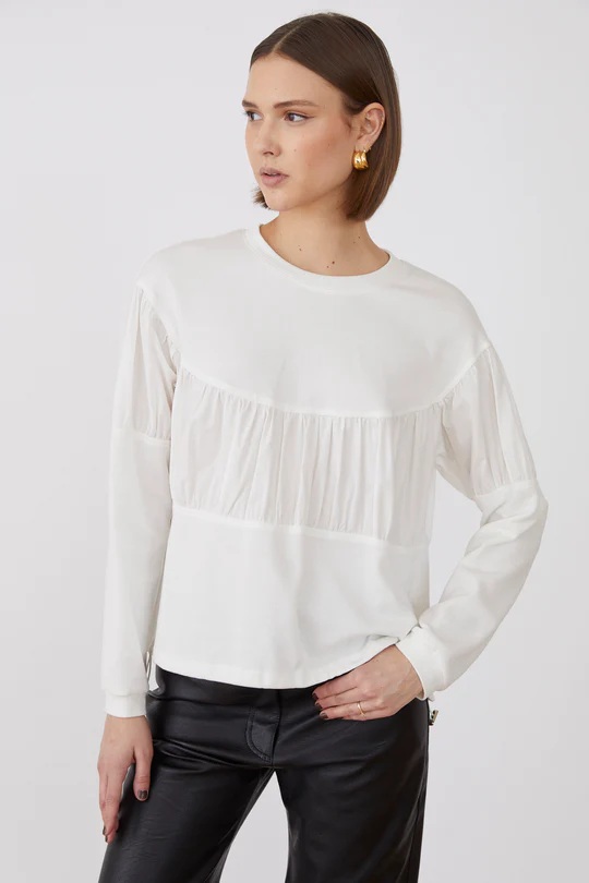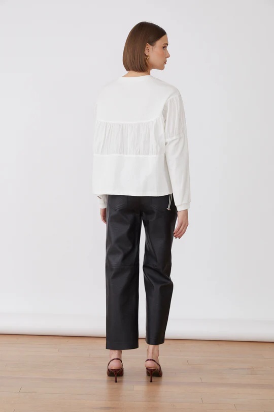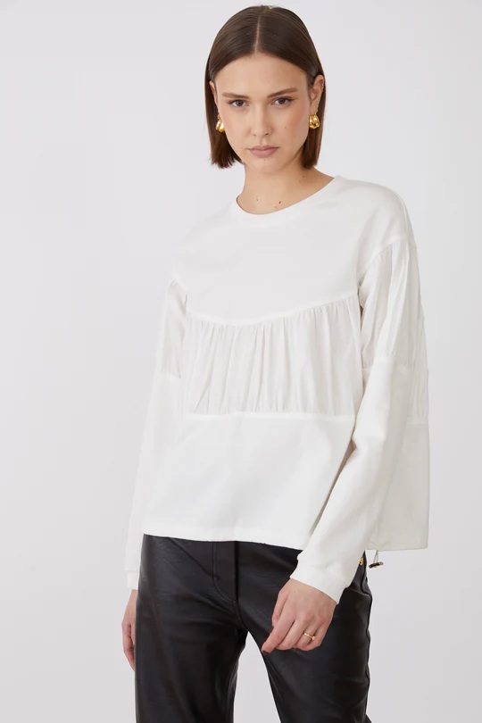 La blusa blanca Roza combina elegancia con un diseño contemporáneo gracias a su mezcla de materiales y sus delicadas mangas largas. Con detalles voluminosos, esta blusa aporta una silueta refinada y vanguardista, perfecta para realzar cualquier armario sofisticado