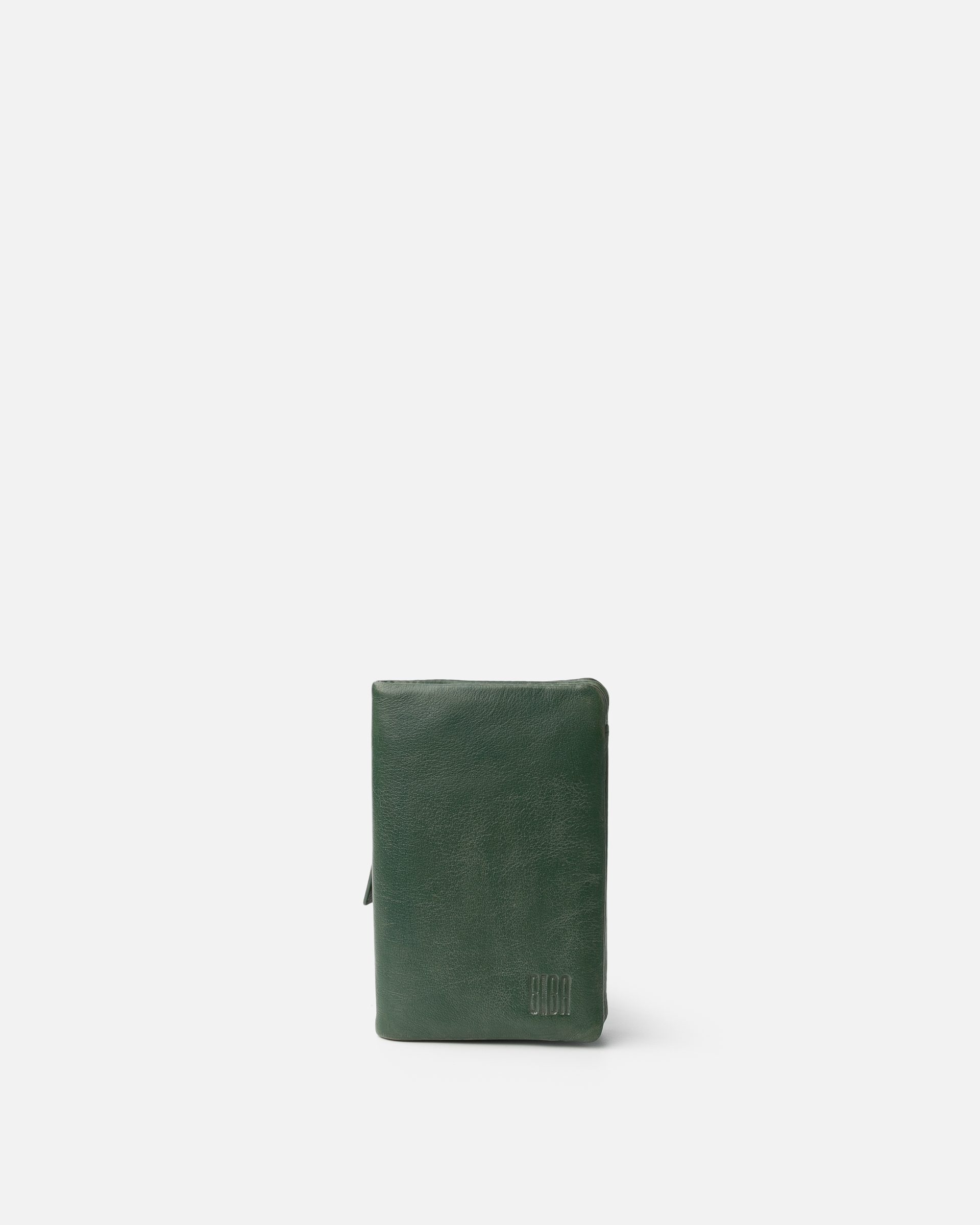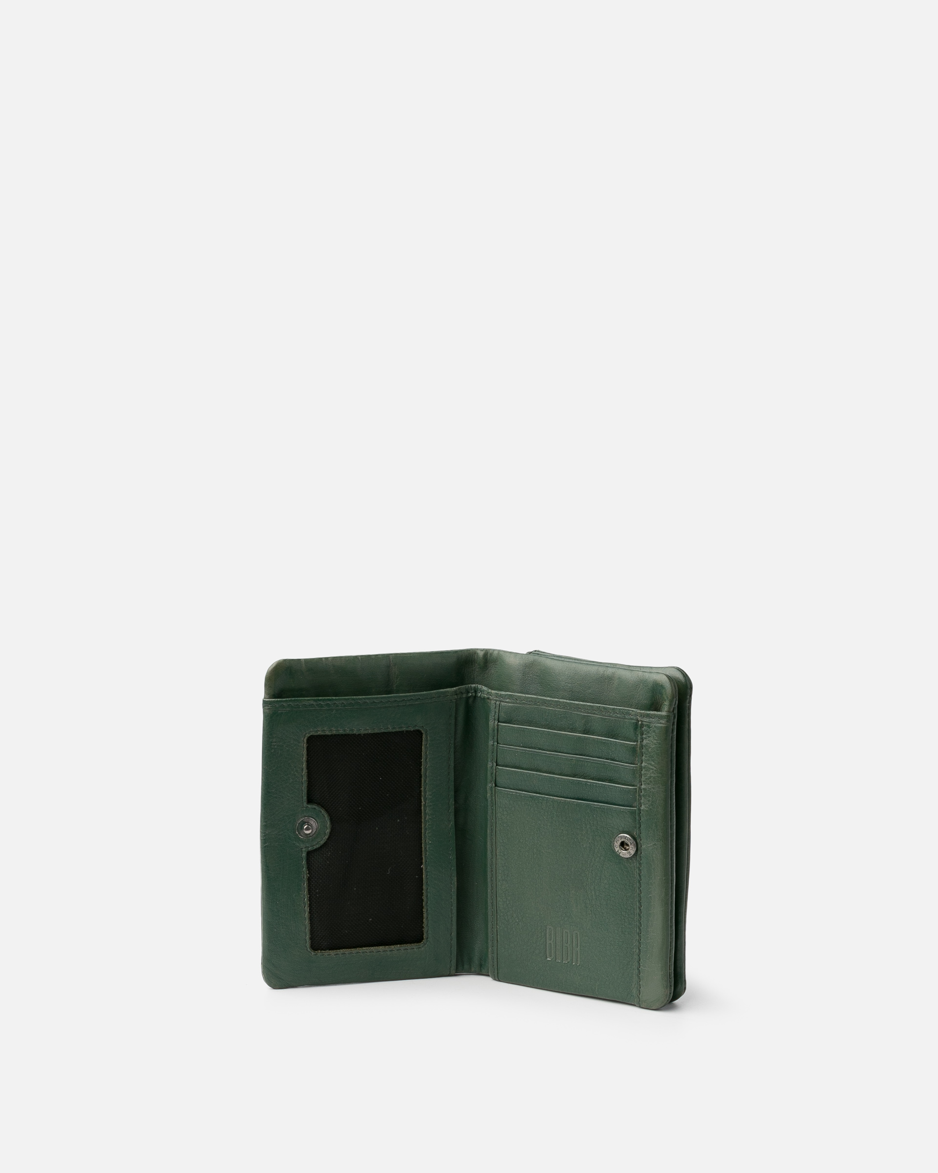 Billetero pequeño de piel natural. Bolsillo con cremallera en el dorso. Varios departamentos para tarjetas, papeles y billetes. Cierre a presión.