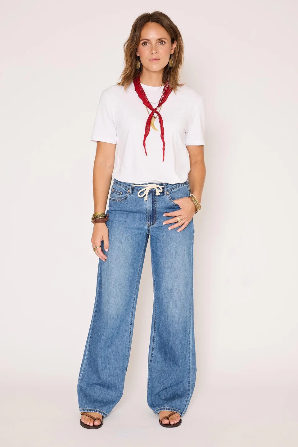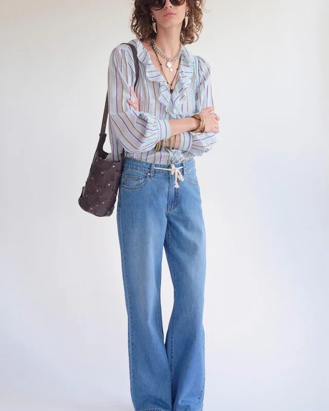 Vestido de mezclilla con silueta recta, escote con cuello y largo midi. Cierre frontal con botones a presión, mangas hasta el codo y dos bolsillos en el pecho. Cinturón de lazo que define la cintura para un look ajustado pero fácil.