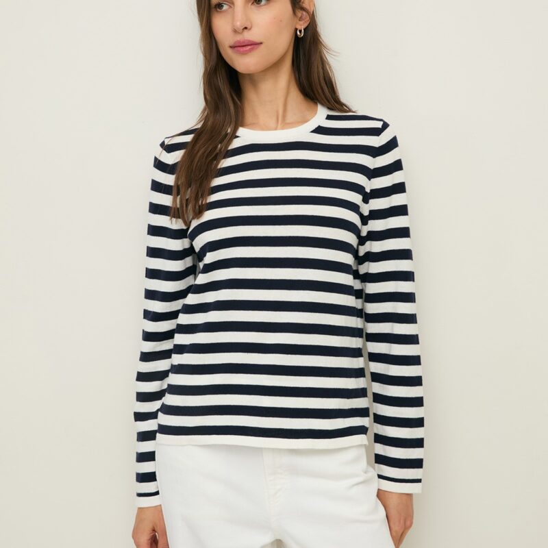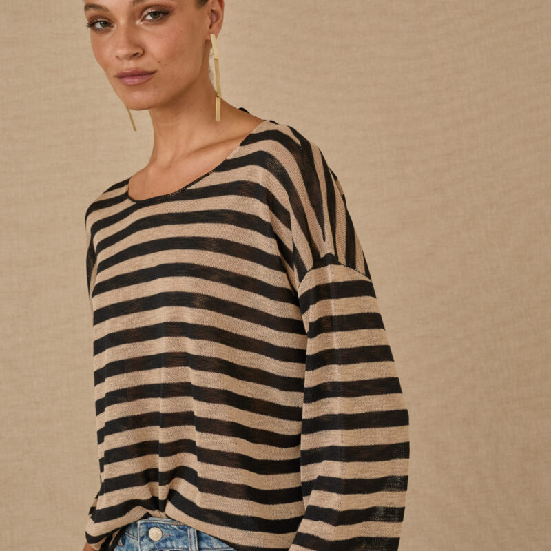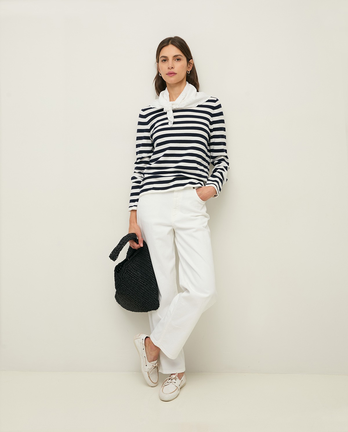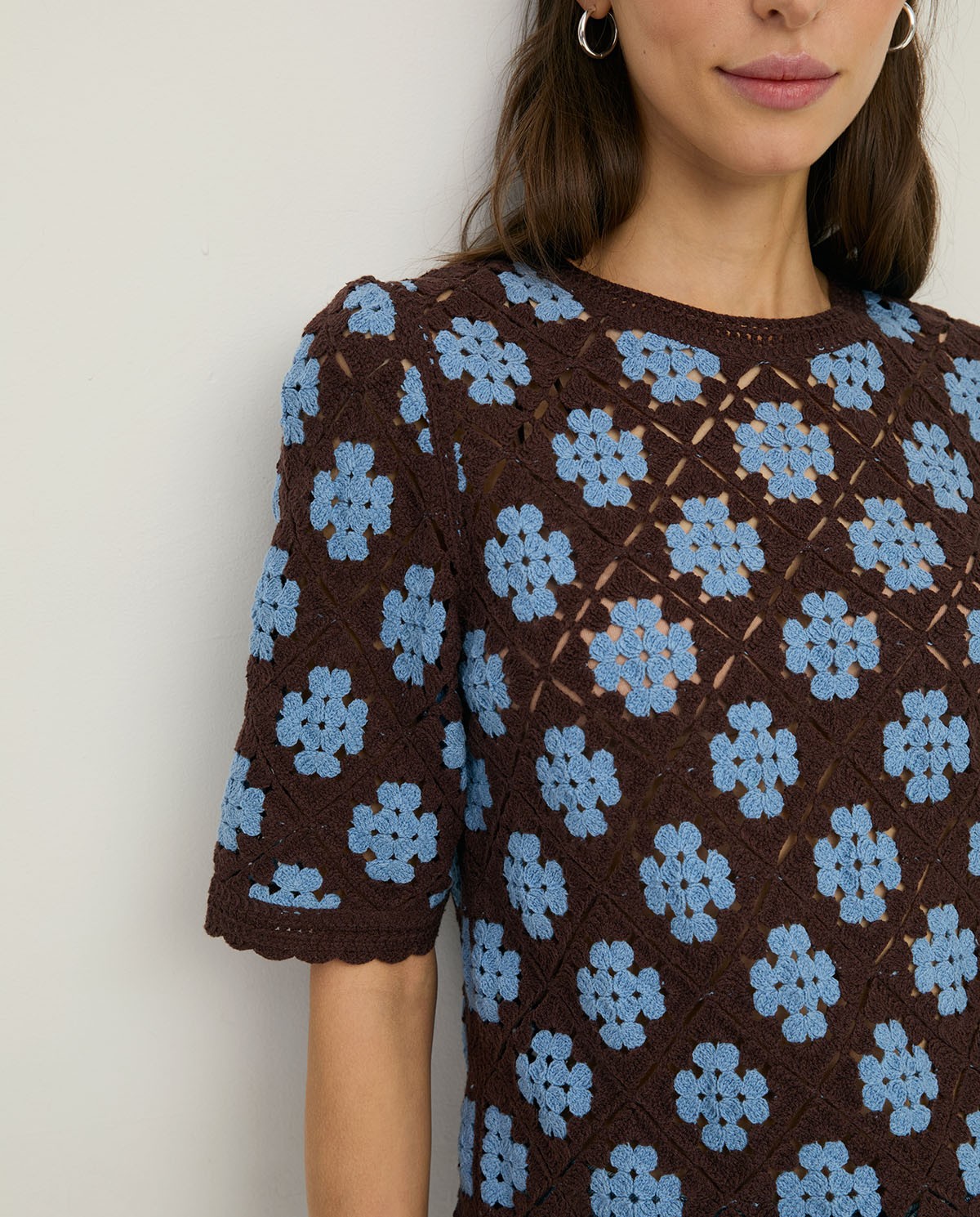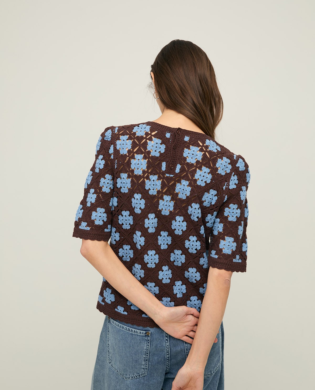 Jersey de punto calado con motivo floral tipo crochet en contraste de color chocolate y azul. Elaborado en una mezcla de algodón y acrílico. Cuello redondo y cierre con 3 botones en la espalda. Manga corta. Acabados en forma ondulada. Botones. Galga media. Longitud desde el hombro: 56 cm (talla S).