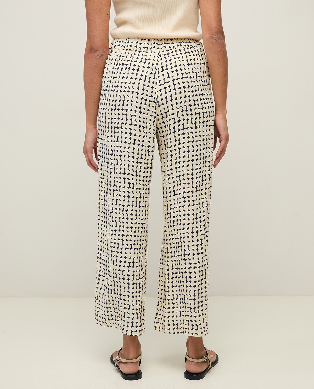 Pantalón fluido de color azul oscuro. Elaborado en una mezcla de viscosa y EcoVero™. Diseño estampado geométrico. De tiro medio y regular fit. Cinturilla elástica detrás. Longitud interior de la pierna: 71 cm (talla S).