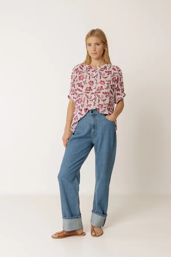 Camisa de manga corta abullonada con print de maxi acuarela y tejido en georgette de viscosa ligeramente transparente. Tiene un fit estándar, perfecto para los días de calor.