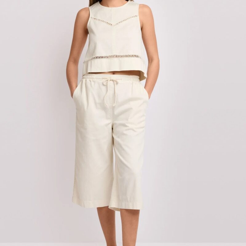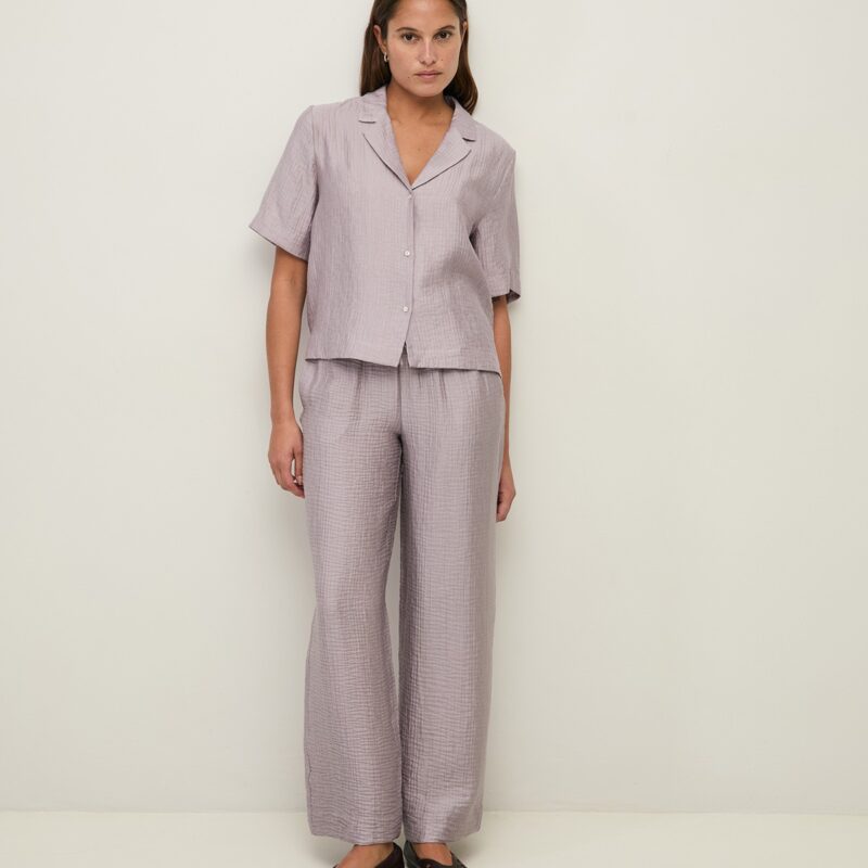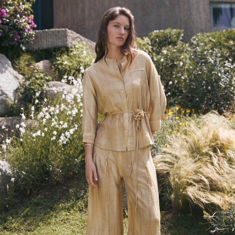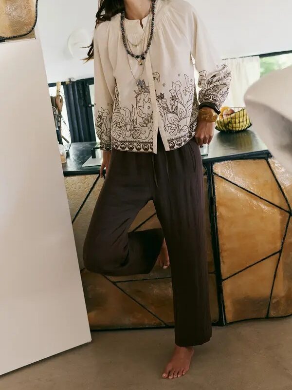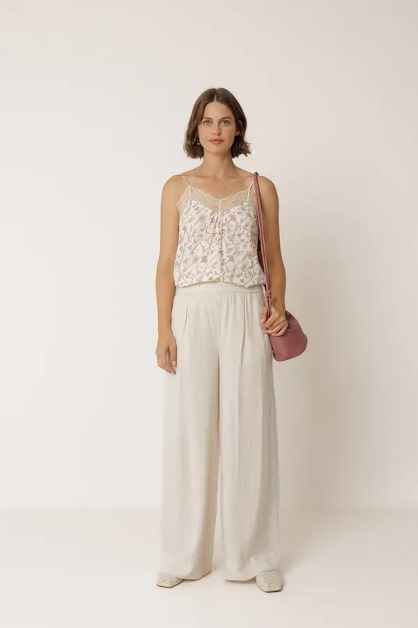 Este pantalón fluido confeccionado en viscosa y lino, es un básico que podrás combinar en todos tus looks. De cinturilla engomada y corte relajado, es una prenda muy cómoda para el día a día.