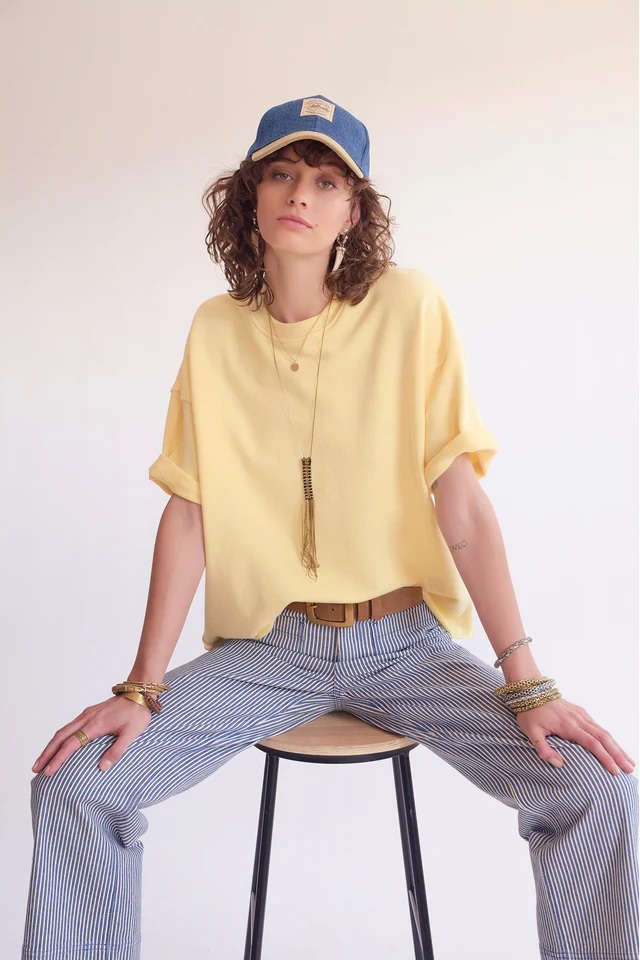 Camiseta básica de cuello redondo amplio, pensada para una silueta simple y moderna. El corte es cómodo, fácil de llevar a diario. Disponible en sun para un toque luminoso o en boudoir para una nota más suave, se integra naturalmente en todos los looks, del más casual al más elaborado.