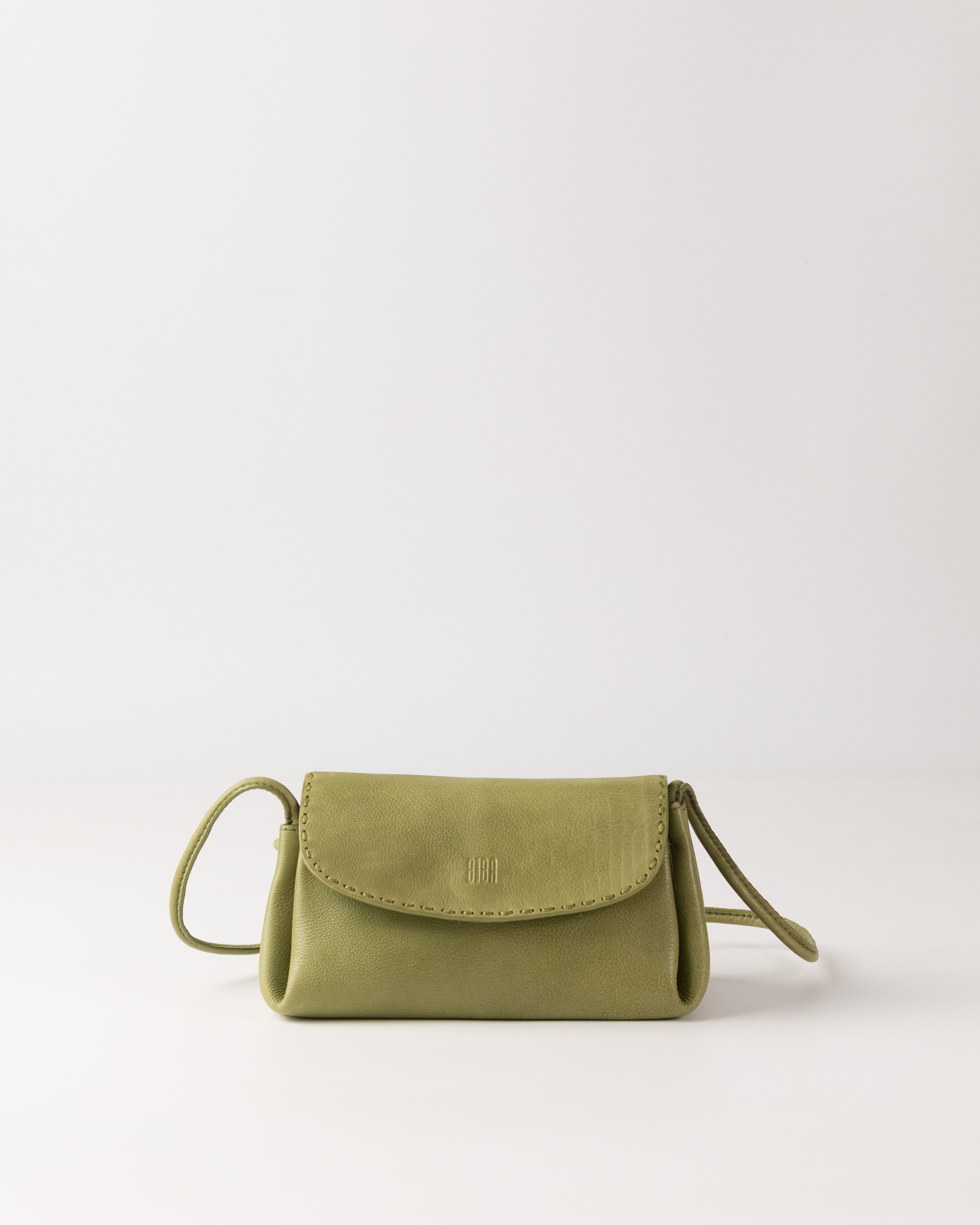 Bolso bandolera de piel vacuna lavada. Cierre con solapa y botón. Tres compartimientos, de los cuales uno cierra con cremallera.