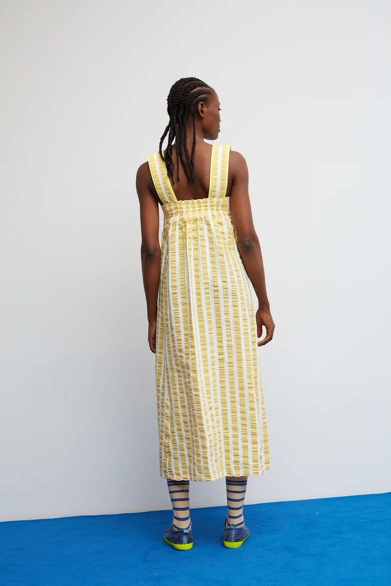 Vestido largo de tirantes con silueta recta y caída fluida. Confeccionado en tejido ligero de rayas verticales amarillas y blancas con textura arrugada, que aporta movimiento y un aire relajado muy veraniego. Destaca por sus bolsillos laterales grandes en contraste de rayas horizontales, rematados con un perfil flúor que añade ese toque inesperado y divertido tan Bloom. El escote recto y los tirantes anchos equilibran el diseño y lo hacen fácil de llevar durante todo el día.