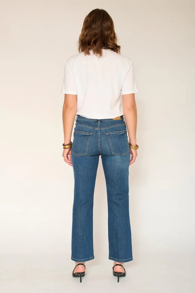 Los jeans Linda Wilson representan el modelo perfecto de pernera recta, con un look atemporal y un corte naturalmente favorecedor. Su corte recto ligeramente entallado equilibra la silueta a la perfección, mientras que su cintura alta proporciona sujeción y elegancia para el día a día. Confeccionados en denim Wilson, ofrecen una caída preciosa y una comodidad duradera, convirtiéndolos en un básico de armario fácil de combinar, desde looks casuales hasta elegantes. Detalles : Corte recto, ligeramente entallado. cintura alta Cómodo y duradero denim Wilson Cierre de cremallera y botón metálico grabado. Cinco bolsillos Largo hasta el tobillo.