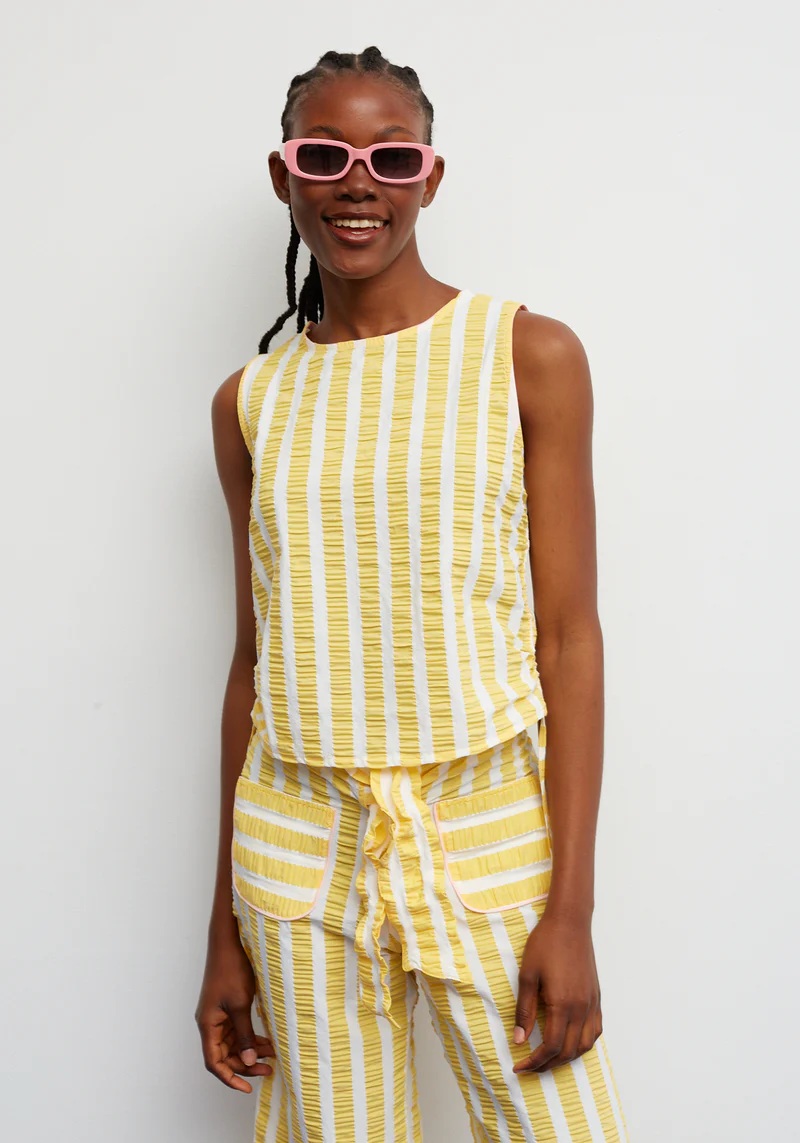Un cuerpo pensado para aportar luz y frescura a los looks de verano. Su diseño combina rayas verticales en amarillo y blanco sobre un tejido con relieve sutil que añade textura y movimiento. Los lazos laterales ajustables permiten fruncir la silueta, ofreciendo un detalle personalizado y único. Con cuello redondo y un corte recto, es una prenda ligera y cómoda, perfecta para los días cálidos.